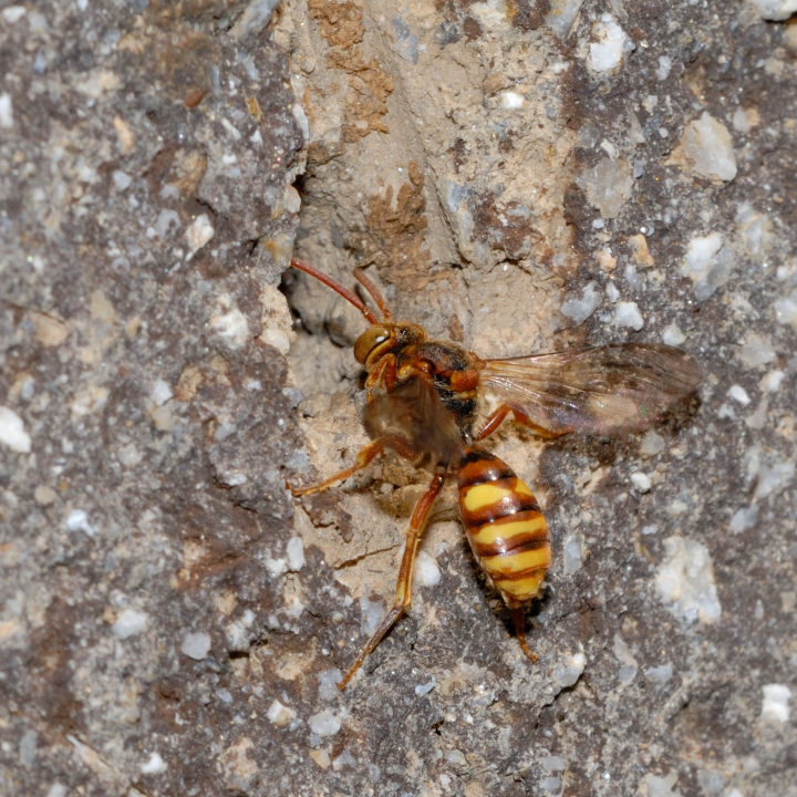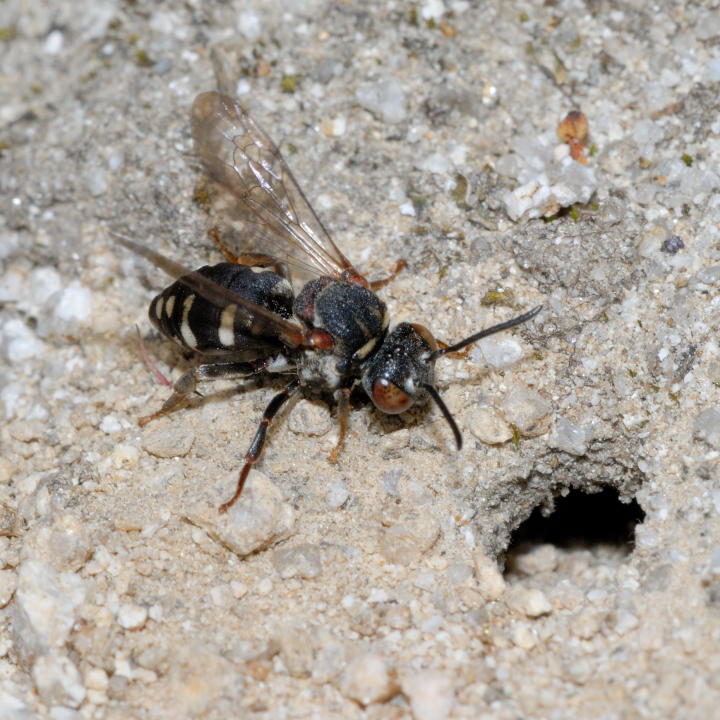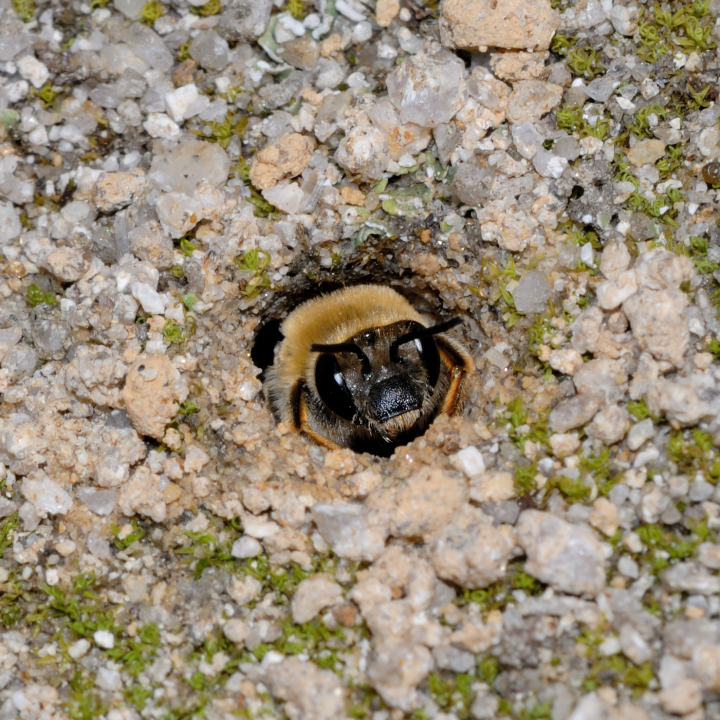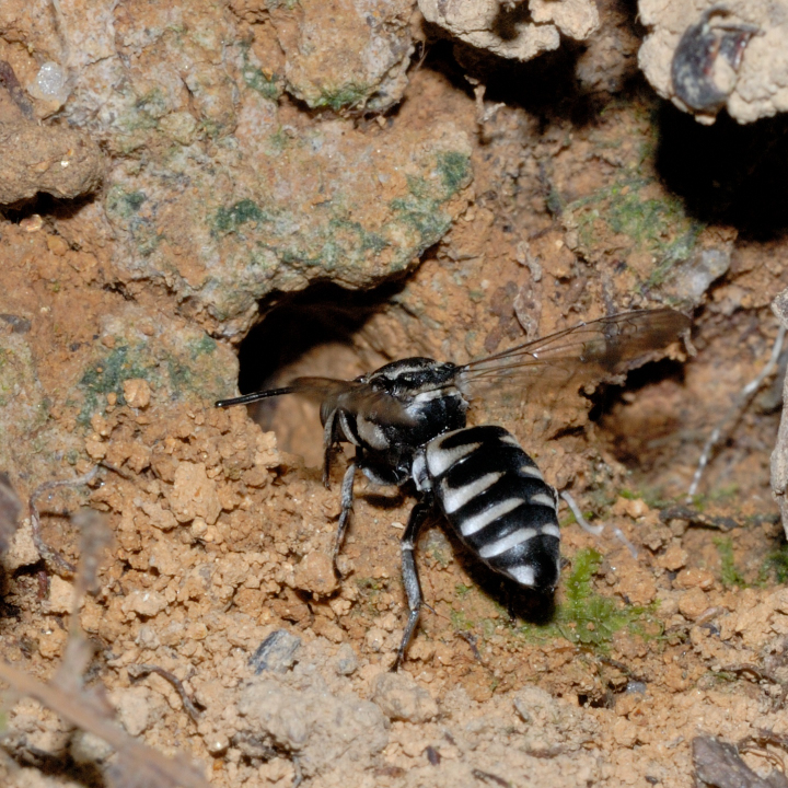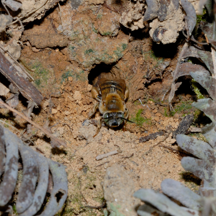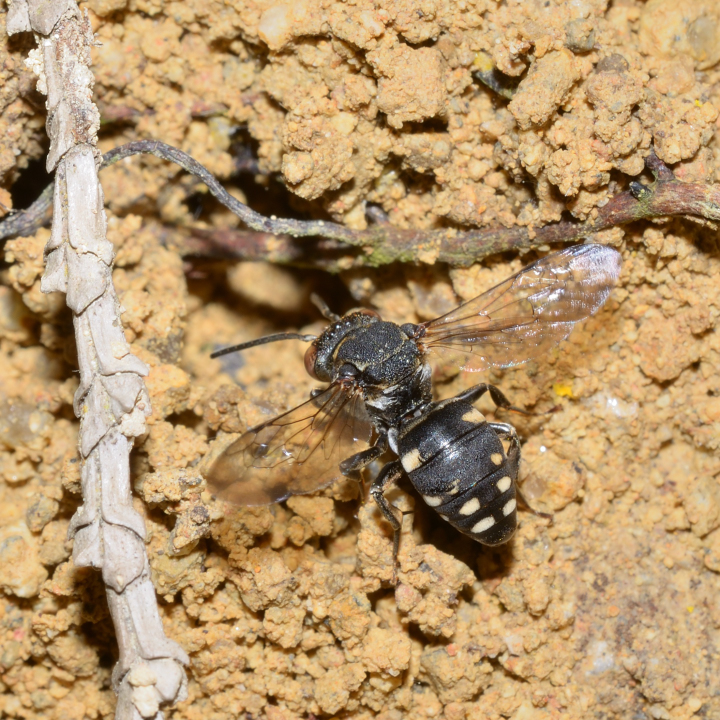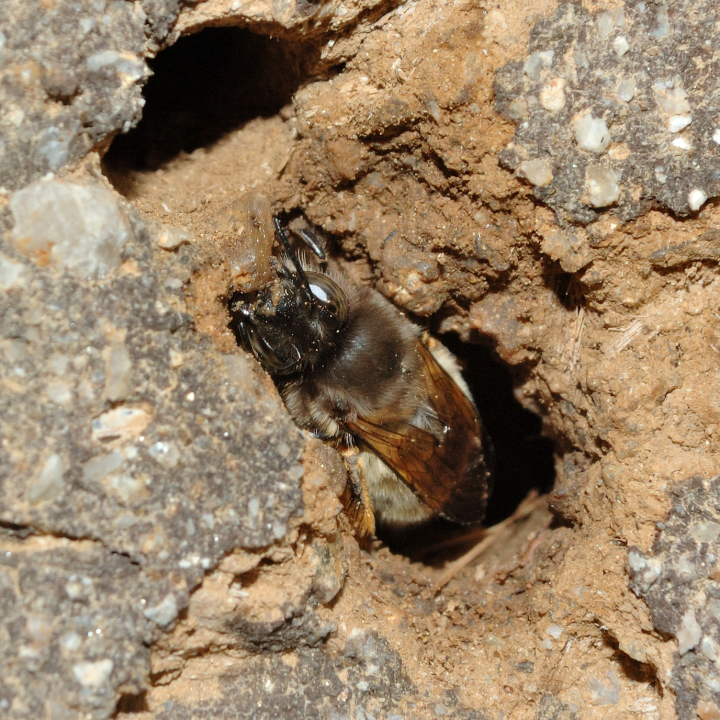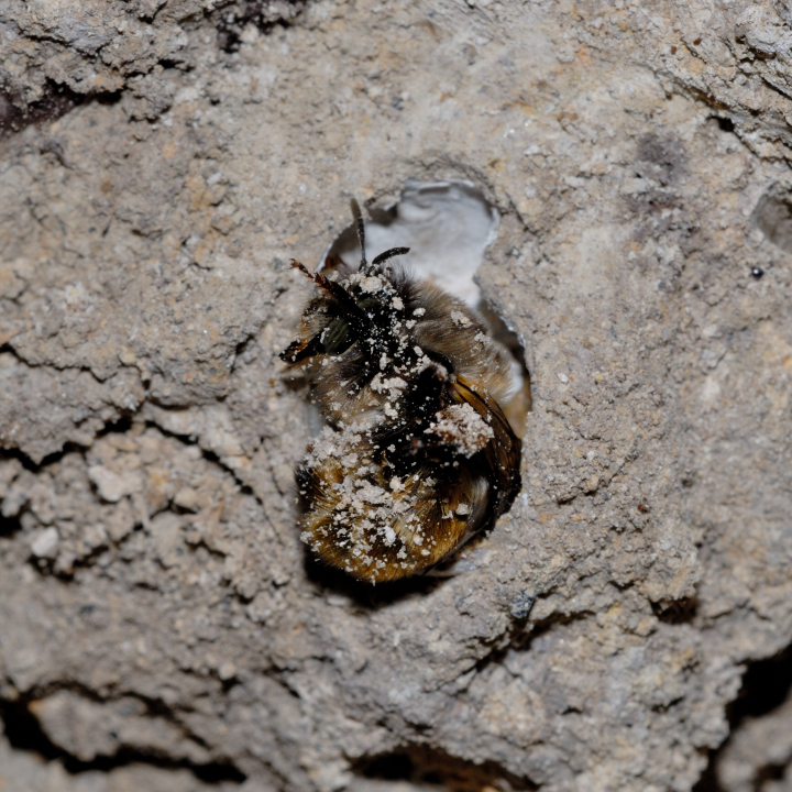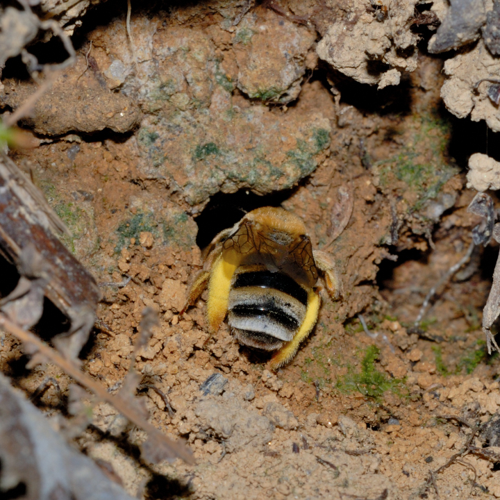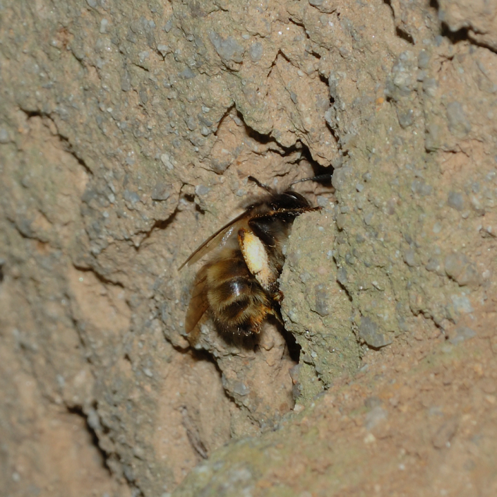 キムネクマバチは坑道の奥に、坑道よりやや広い育房を作り、2つ目の育房を作る際に、坑道を広げる時に出る廃材で、1育房目の隔壁を作るという。