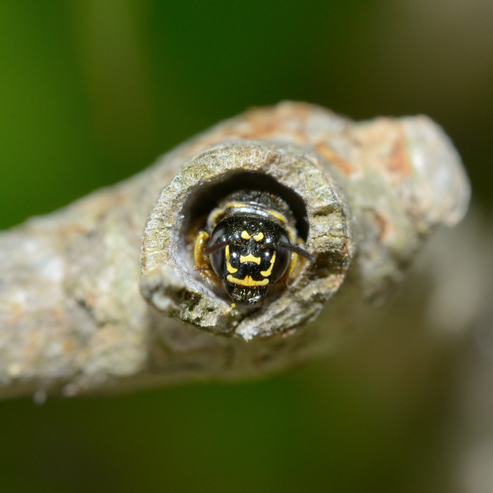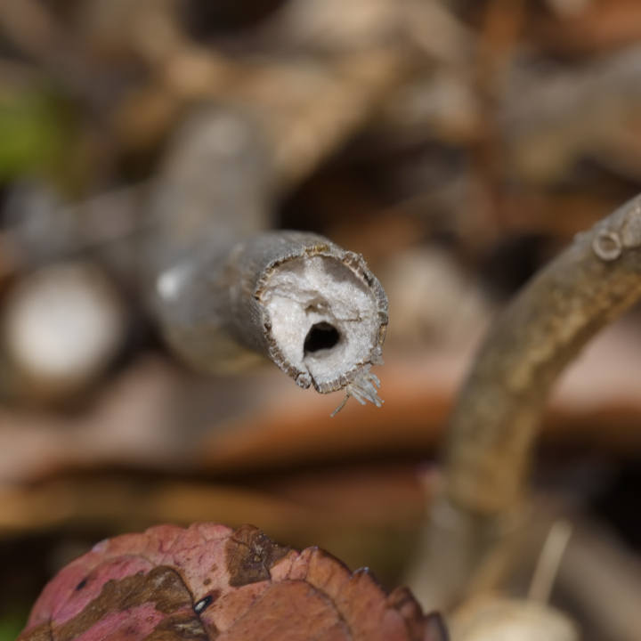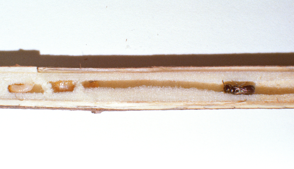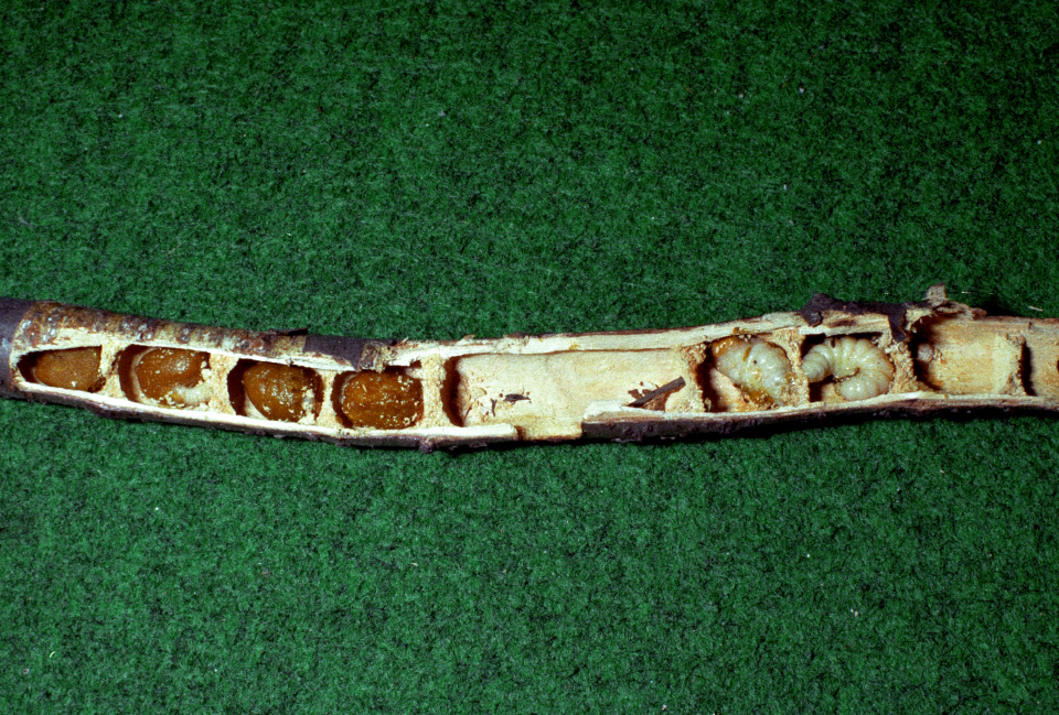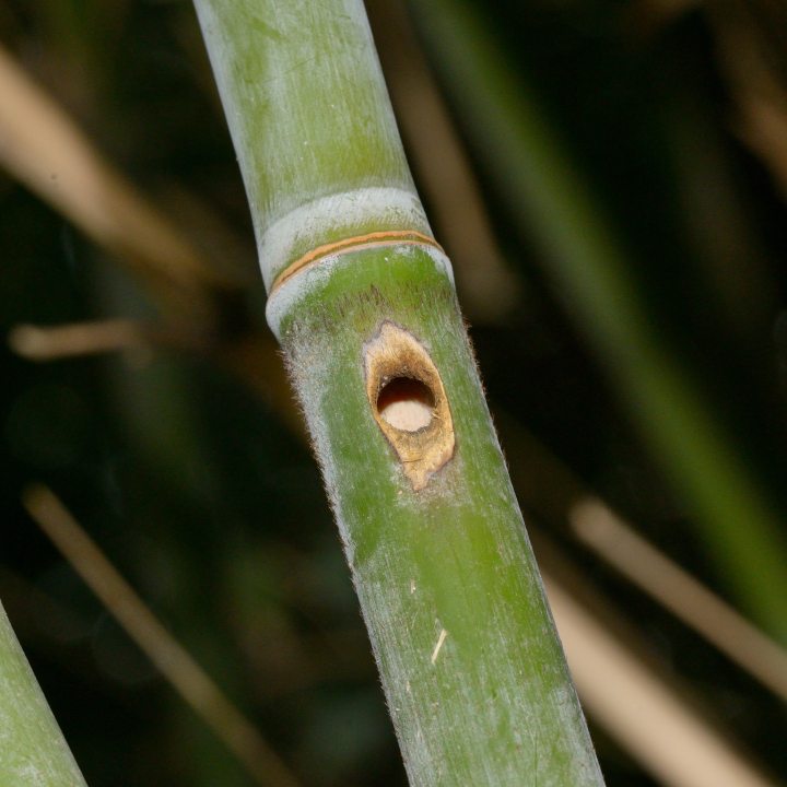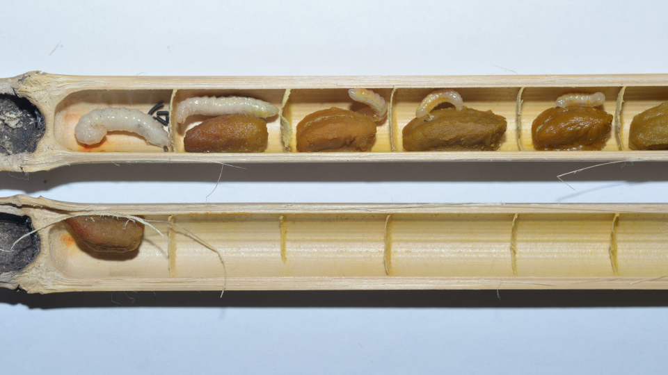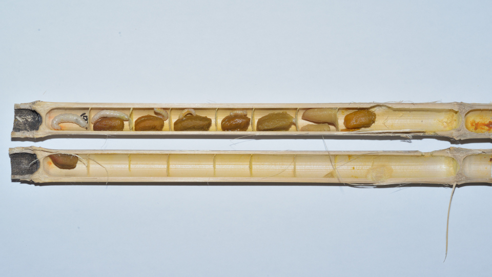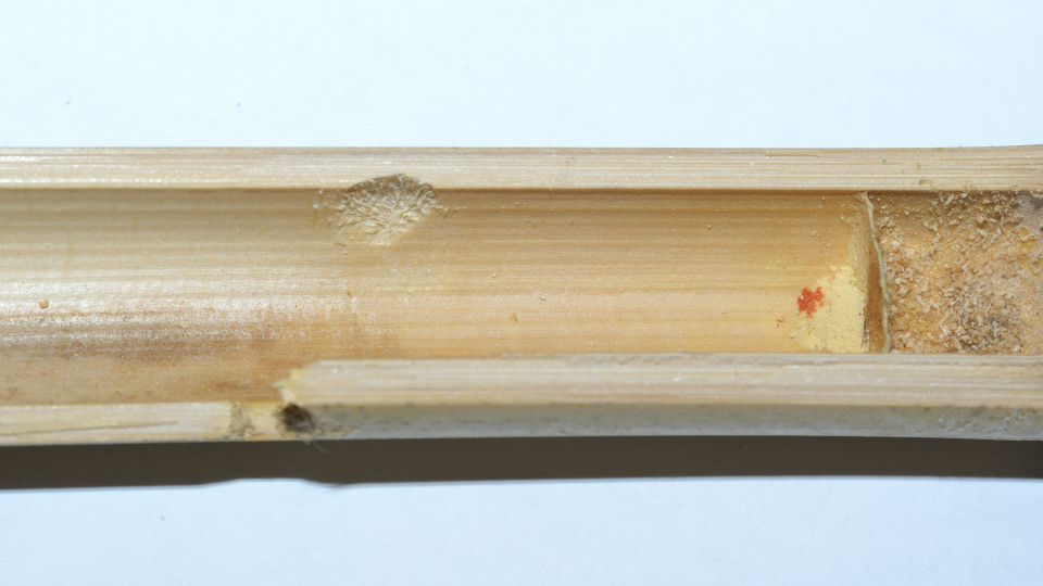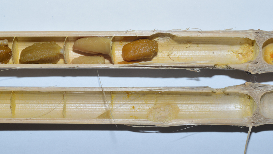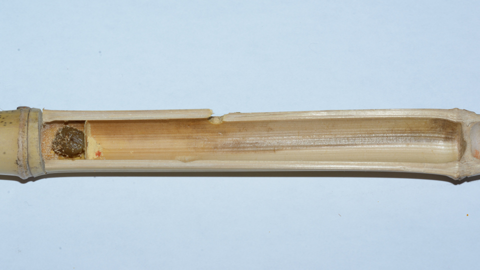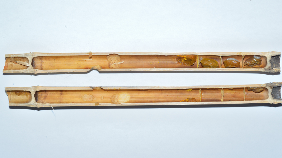 枯れた竹を穿孔し、内壁を削り取って育房の隔壁を作る。