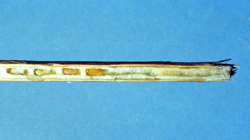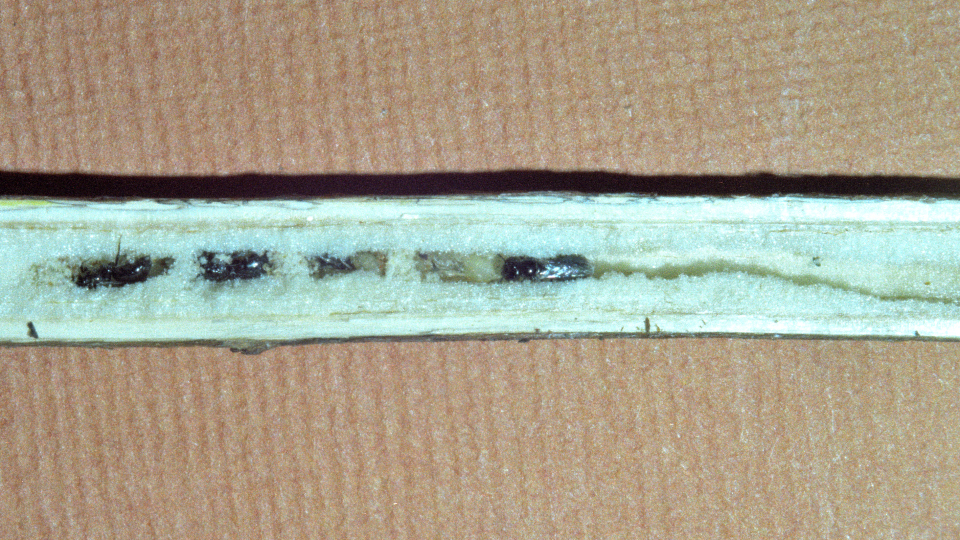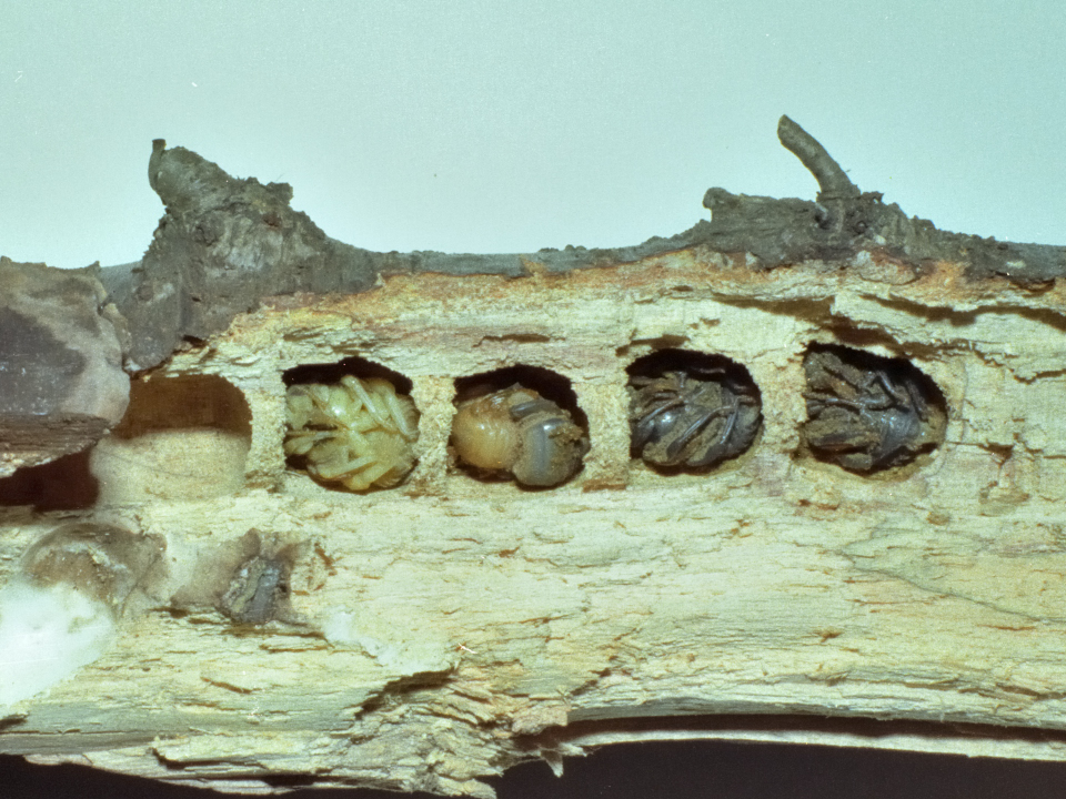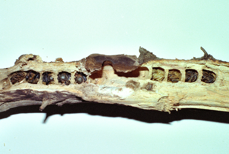 タイワンタケクマバチは全ての育房の隔壁の材料を、内壁のこの一箇所から採取する。